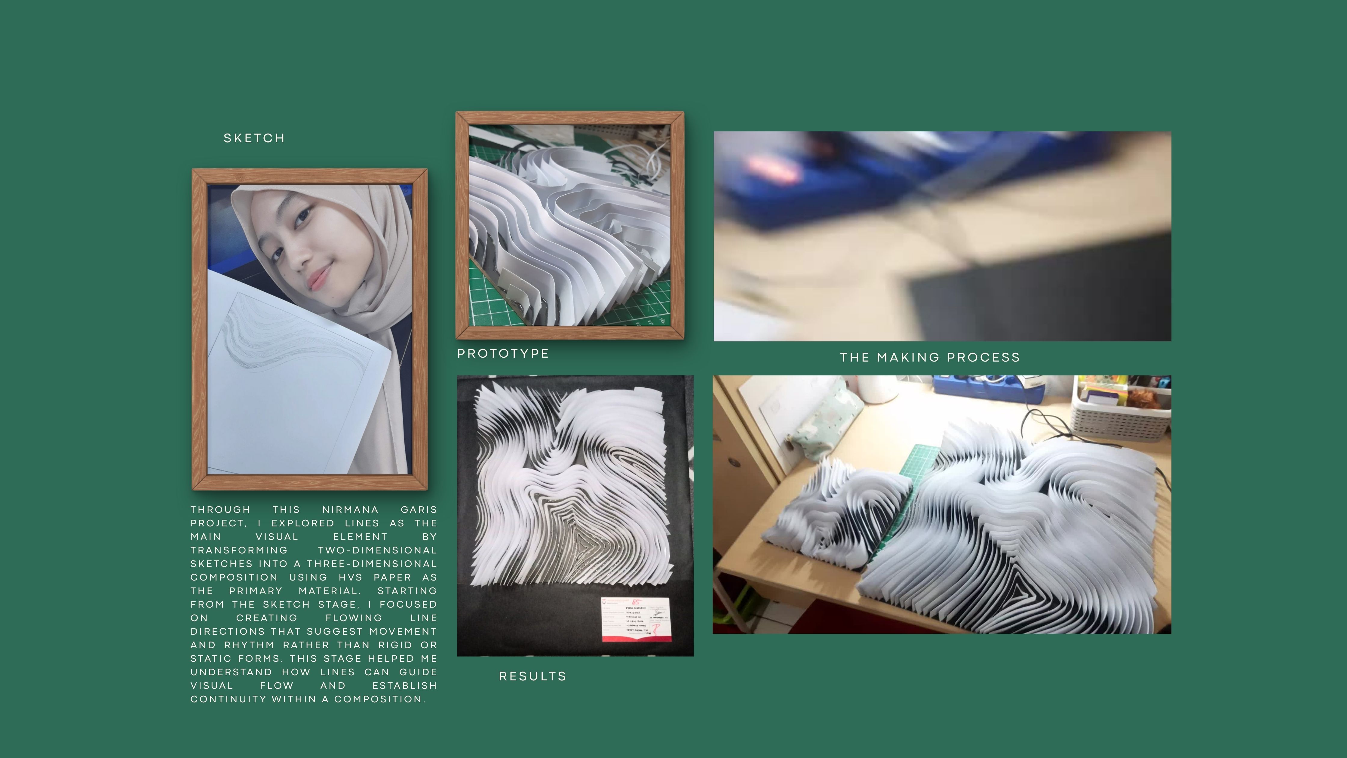 Through this line nirmana project, I explored lines as the main visual element by translating two-dimensional sketches into a three-dimensional form. Starting from the sketch stage, I focused on developing flowing line directions that suggest movement and rhythm rather than rigid structure. This initial exploration helped me understand how lines can guide visual flow and create a sense of continuity within a composition. In the prototyping stage, I transformed the sketched lines into layered forms by cutting and arranging materials in a repetitive sequence. This process allowed the lines to evolve into physical contours, emphasizing depth and spatial interaction. By stacking and aligning each layer carefully, I aimed to maintain the original line direction while introducing volume and texture. During the making process, precision and consistency became essential, as each line-shaped layer had to be positioned accurately to preserve the overall visual rhythm. Small changes in alignment could significantly affect the perception of movement, making this stage both technically demanding and conceptually important. The final result presents line nirmana as a dynamic composition where lines no longer function solely as outlines, but as structural elements that define form, depth, and motion. Through this work, I developed a stronger understanding of how lines can construct space and convey energy, while also strengthening my discipline in planning, prototyping, and execution.